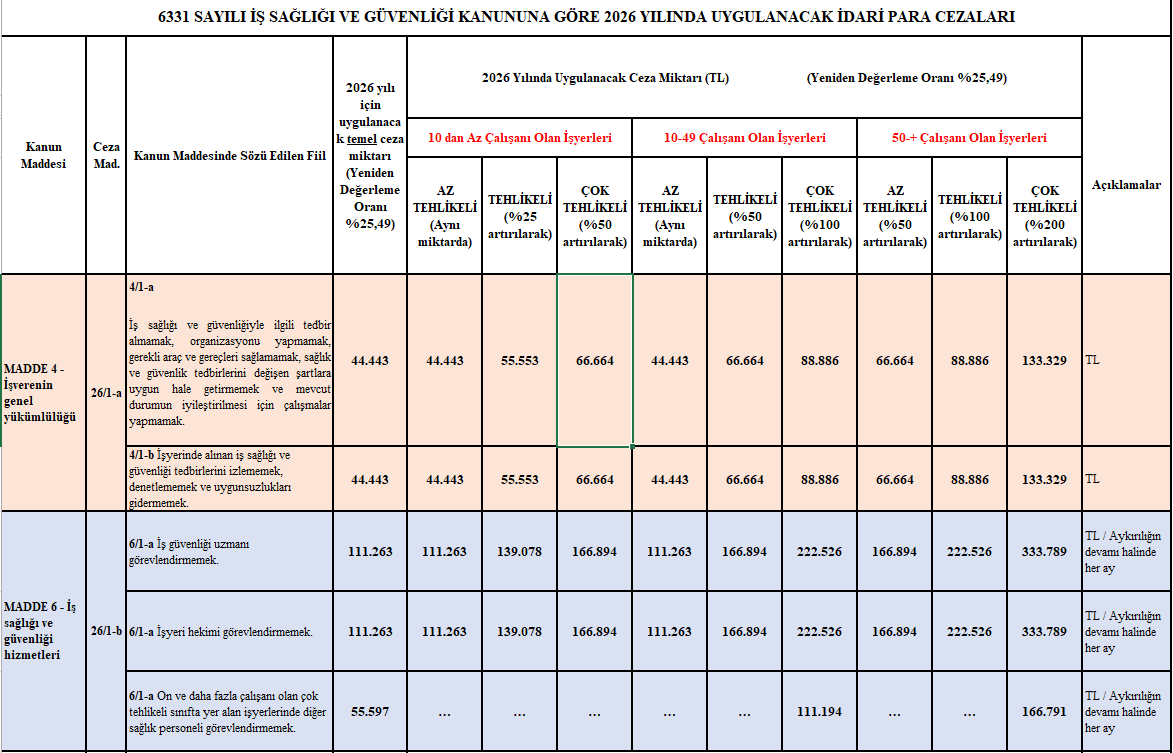 6331 SAYILI İŞ SAĞLIĞI VE GÜVENLİĞİ KANUNUNA GÖRE 2026 YILINDA UYGULANACAK İDARİ PARA CEZALARI